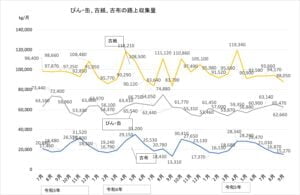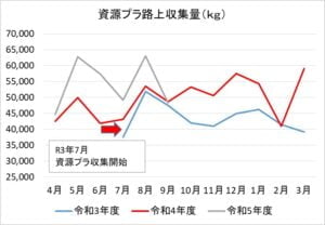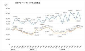「資源プラ」は例年どおり減少に転じました。収集日が2回と3回の月があるため、バラツキがあるのは仕方がありません。
