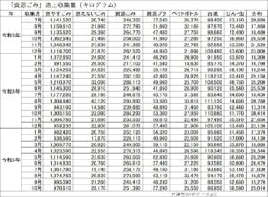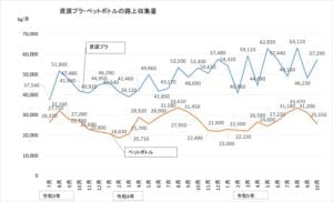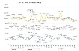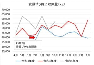 先月、大きく減少していた「資源プラ」は増加に転じました。収集日が2回と3回の月があるため、バラツキがあるのは仕方がありません。