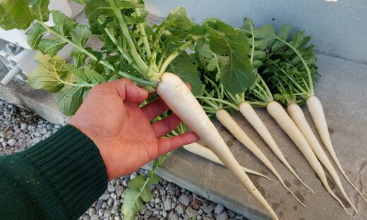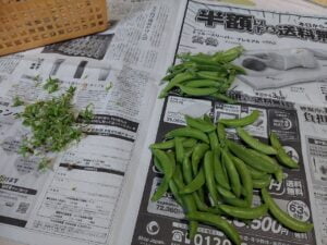 ハサミでチマチマ収穫した後、スジを取るのが僕の仕事です。