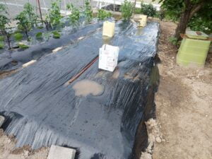 草が生えないように黒マルチを張りました。成長してきたら葦を敷く予定です。