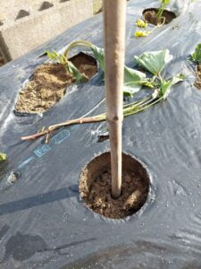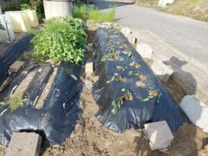 天気の良い日に、畝を作ってマルチを張っていたので、雨が上がったのを見計らって作業をしました。