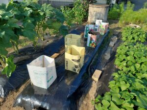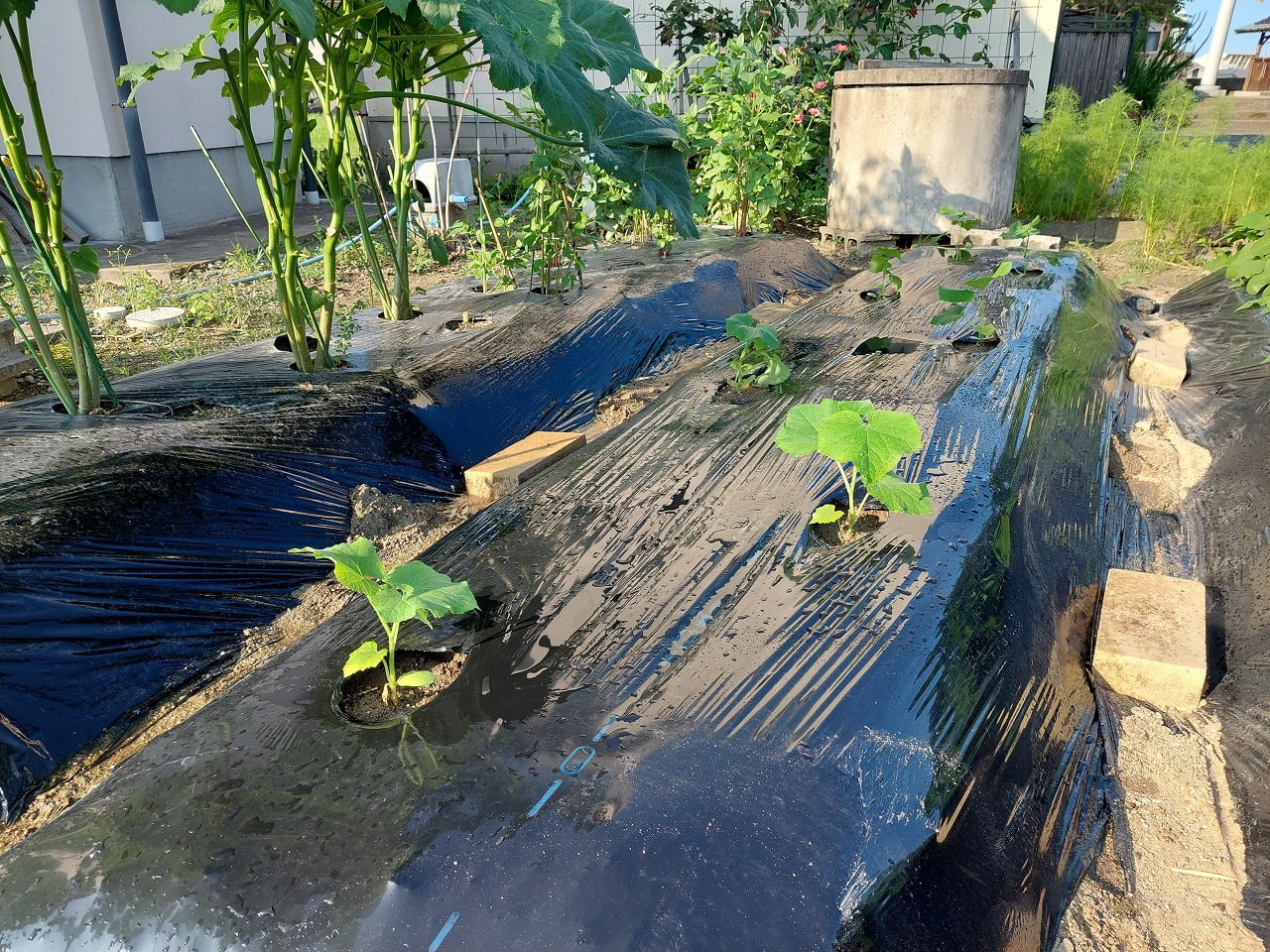 さて、雨の合間をぬって、第2弾のキュウリの苗を7本植えました。