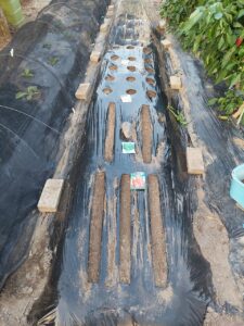草が生えないように黒マルチを切り抜いて、種を蒔きます。