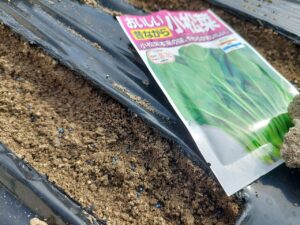 種がなかったので、前回に蒔けなかった水菜と小松菜です。