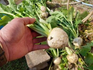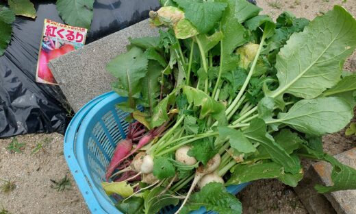 畑のカブ大根を間引きました。