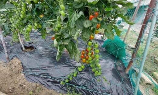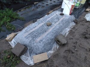 さて、週末にかけて寒波がやって来るとの予報に、慌てて種まきをした畝にビニールシートかけました。