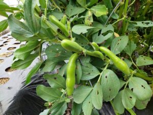 上を向いていたサヤが下に垂れ、背筋が黒褐色になったら収穫どきです。