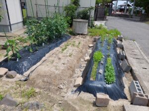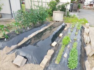 この畝には、モロヘイヤの苗を植えて、ニンジンの種を蒔く予定です。