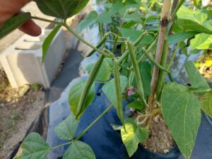 さて、庭の畑のツルなしインゲンを初収穫しました。