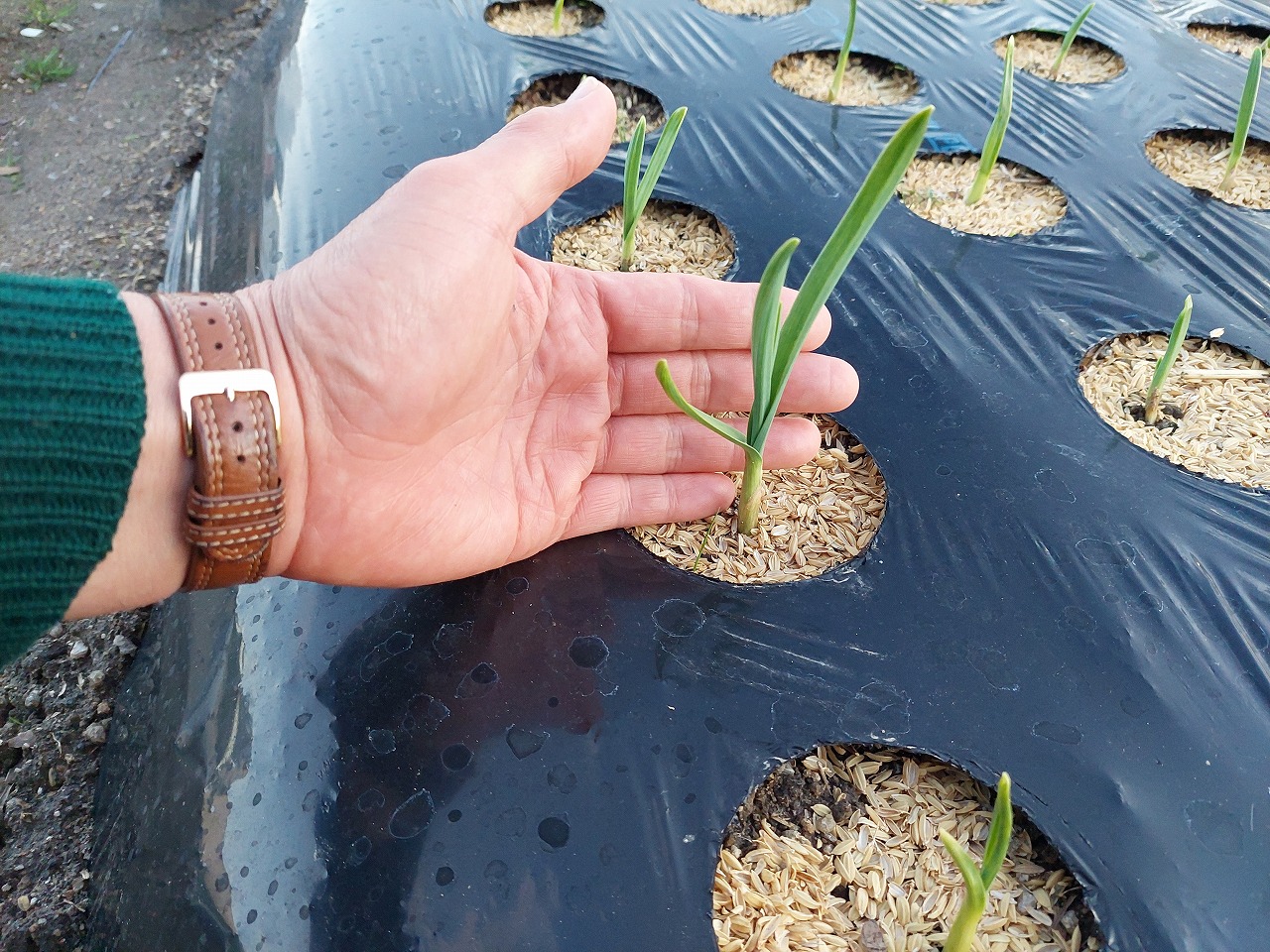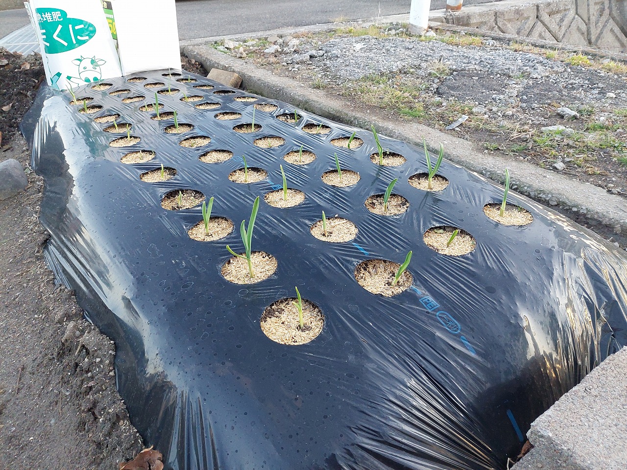 さて、庭の畑に植えているニンニクの芽が出揃いました。