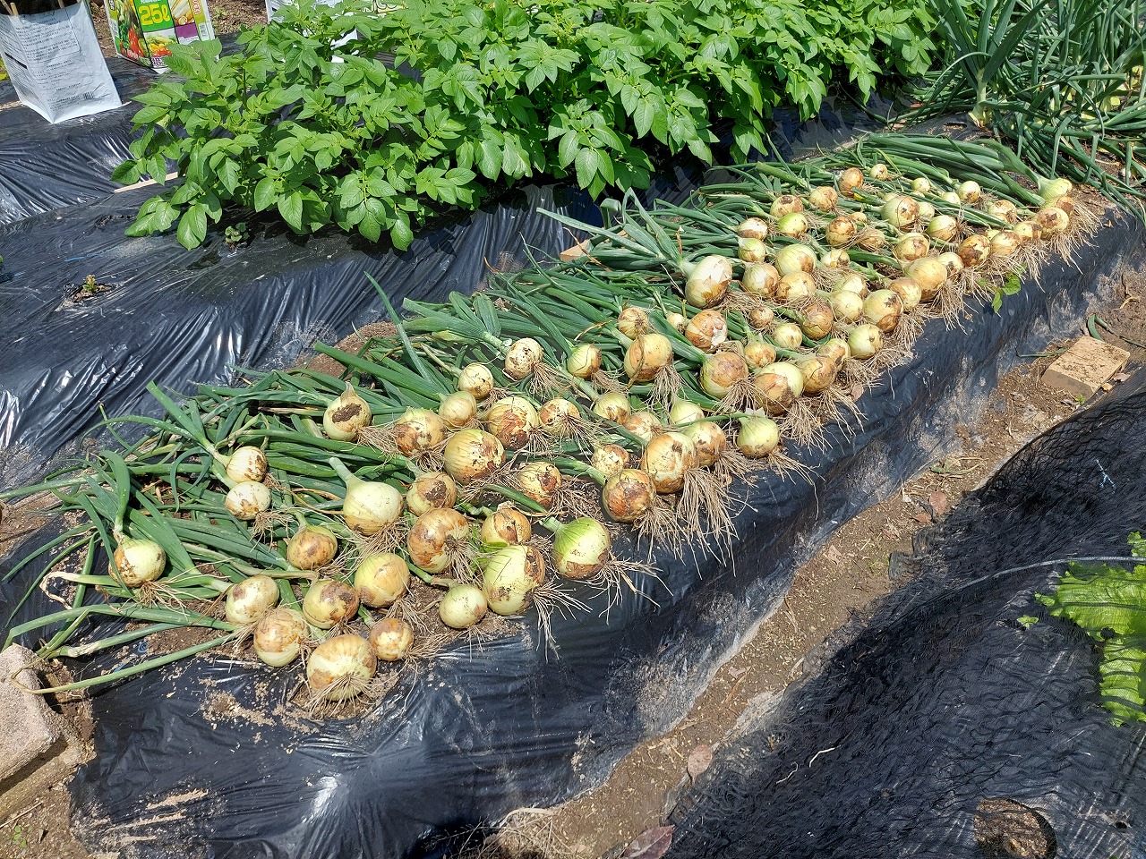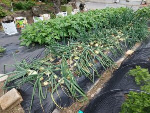 2週間遅れで植えた奥の玉ネギ50本は、30%程度しか茎が折れていないので、もうしばらく待ちます。