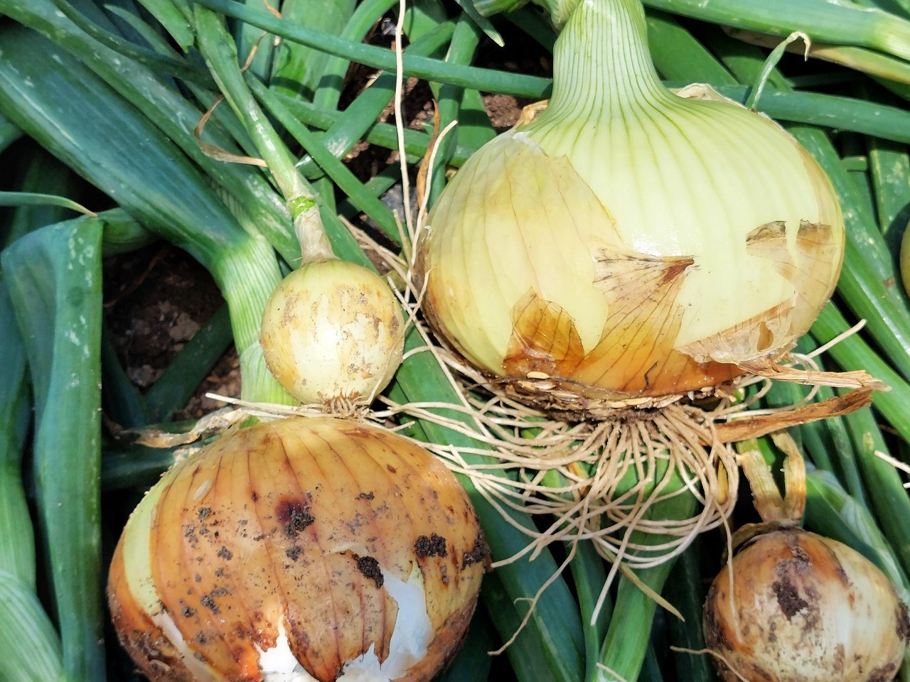 さて、久し振りに晴れ間が出たので、庭の玉ネギを収穫しました。