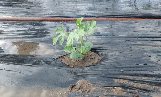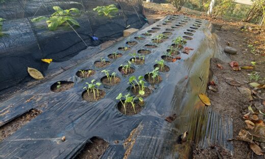 ジャガイモの芽が伸びてくるとマルチを押し上げるので、穴をあけてやります。