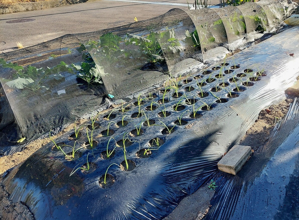 黒マルチに、ちまちま穴をあけて植え付けをしました。