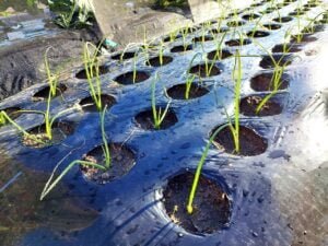 さて、庭の畑に玉ネギの苗50本を植え付けました。