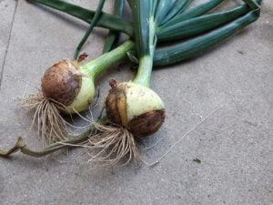 約8割の茎が倒れてから収穫するそうですが、待ちきれずに2個だけ収穫しました。