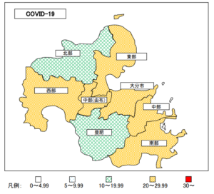 中津市を含む県北部は170人(先週131人)、定点当り17人(先週13.1人)、中津市は定点当り9.2(先週4.4人)と倍増しています。