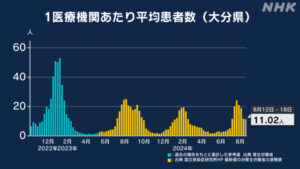 大分県の現在の状況は、厚生労働省のデータ(青色の棒グラフ)と比較すると昨年1月の第8波の最大値(52.7人)の約21.2%の感染者数と言えます。