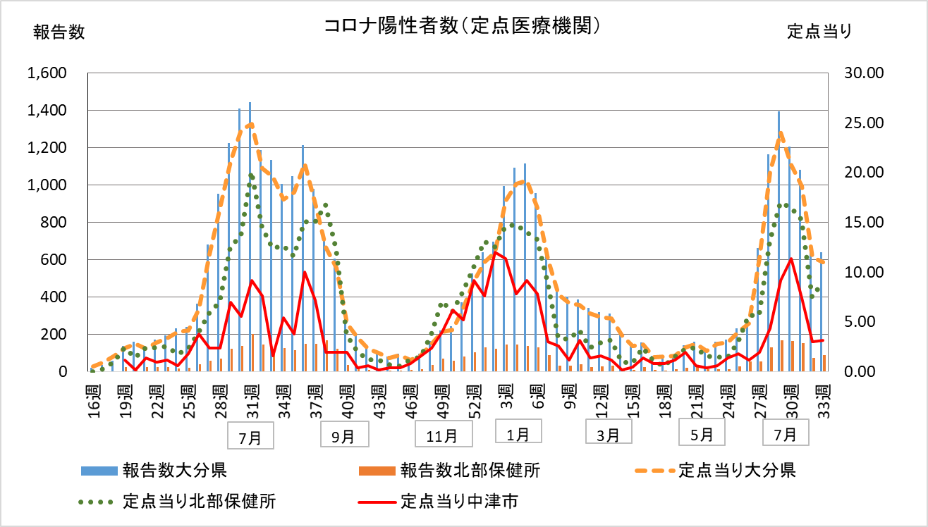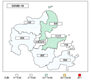 中津市を含む県北部は90人(先週75人)、定点当り9.0人(先週7.5人)、中津市は定点当り3.2人(先週3人)といずれも増加しています。