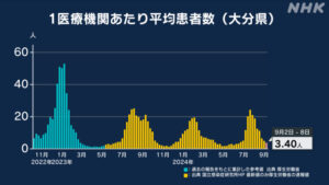 大分県の現在の状況は、厚生労働省のデータ(青色の棒グラフ)と比較すると昨年1月の第8波の最大値(52.7人)の約6.4%の感染者数と言えます。