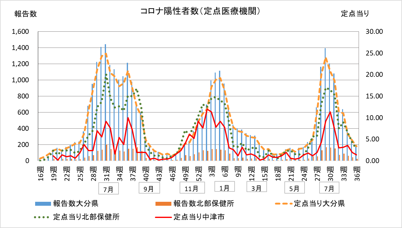 中津市を含む県北部は27人(先週44人)、定点当り2.7人(先週4.4人)、中津市は定点当り1.4人(先週2.0人)と減少しています。
