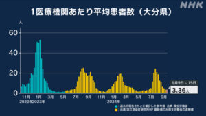 大分県の現在の状況は、厚生労働省のデータ(青色の棒グラフ)と比較すると昨年1月の第8波の最大値(52.7人)の約6.4%の感染者数と言えます。