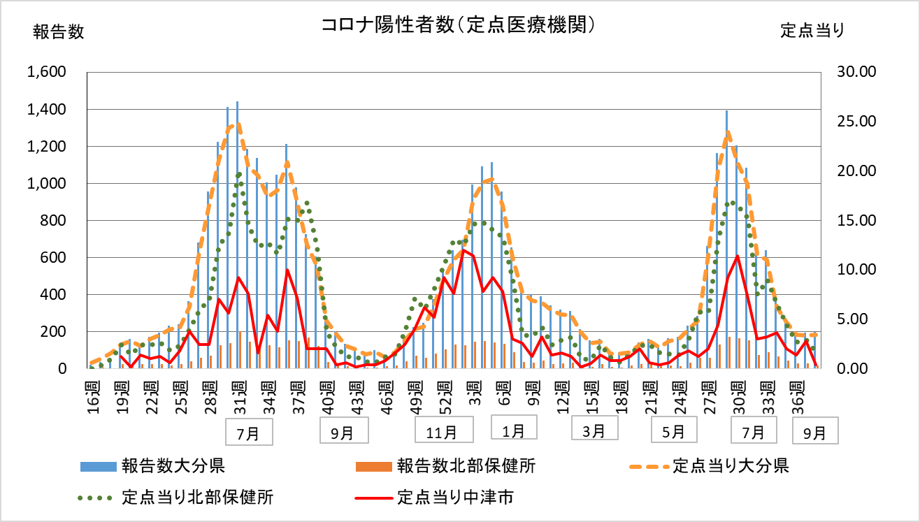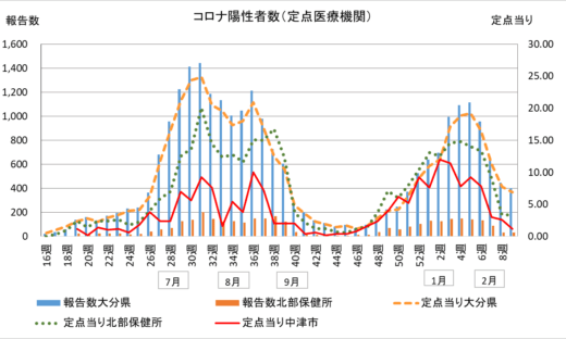 中津市を含む県北部は16人(先週29人)、定点当り1.6人(先週2.9人)、中津市は定点当り0.4人(先週2.8人)と減少しています。