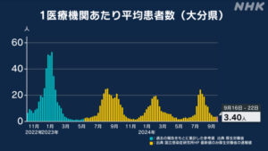 大分県の現在の状況は、厚生労働省のデータ(青色の棒グラフ)と比較すると昨年1月の第8波の最大値(52.7人)の約6.5%の感染者数と言えます。