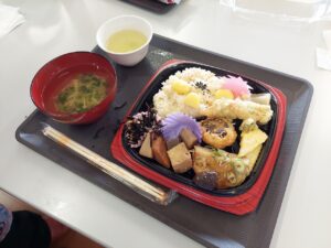 お昼ご飯は、美味しいお弁当とお吸い物をいただきました。