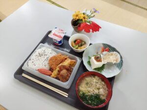お昼は、お弁当にサラダ、冷ややっこをいただきました。