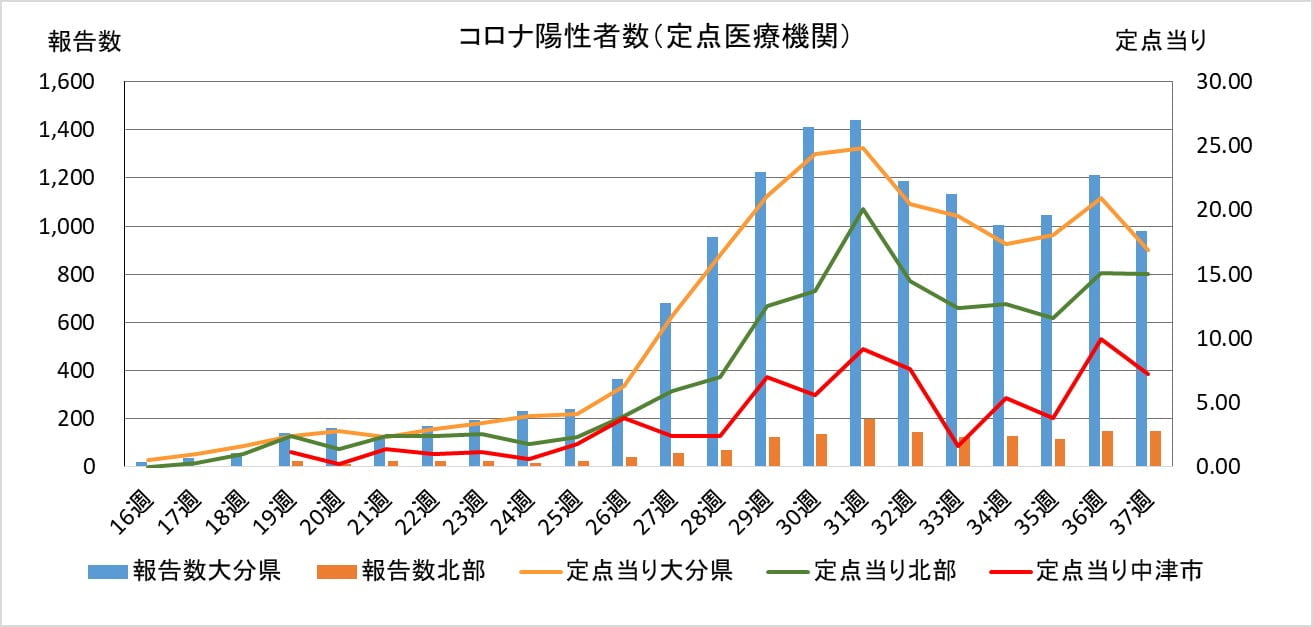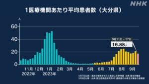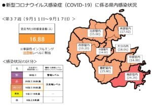 さて、大分県は、37週(9月11日~9月17日)の新型コロナウイルスの感染者数が58定点医療機関から979人(定点当り16.88人)報告されました。先週の1,213人(定点当り20.91人)と比較すると減少していますが、引き続き感染対策を心掛けてください。と発表しました。