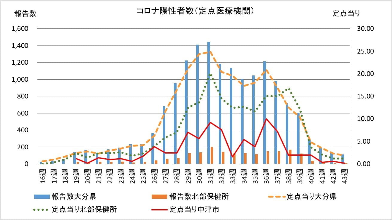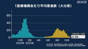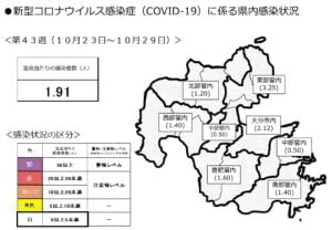 さて、大分県は、43週(10月23日~10月29日)の新型コロナウイルスの感染者数が58定点医療機関からから111人(定点当り1.91人)報告され、先週の133人(定点当り2.29人)と比較すると減少しています。と発表しました。