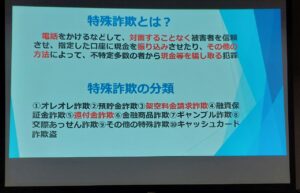 今回は、中津警察署生活安全課の若山課長から「北部校区における防犯と特殊詐欺被害の防止対策」と題して、ご講演を頂きました。