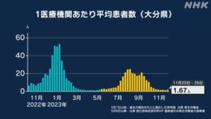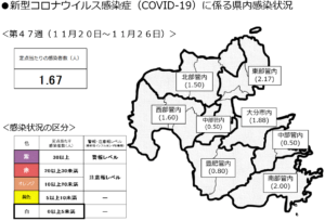 さて、大分県は、47週(11月20日~26日)の新型コロナウイルスの感染者数が58定点医療機関からから97人(定点当り1.67人)報告され、先週の67人(定点当り1.16人)と比較すると増加しています。