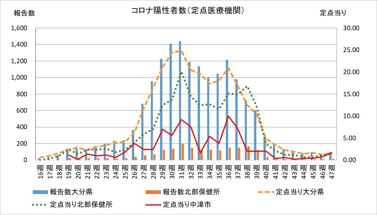 中津市を含む県北部は、15人(先週12人)、定点当り1.5人(先週1.2人)、中津市は定点当り1.6人(先週0.8人)となっています。