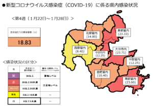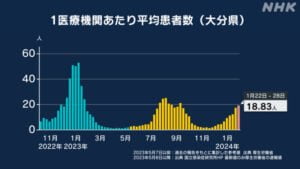 さて、大分県は、令和6年4週(1月22日~28日)の新型コロナウイルスの感染者数が58定点医療機関からから1092人(定点当り18.83人)報告され、先週の995人(定点当り17.16人)と比較すると増加しています。