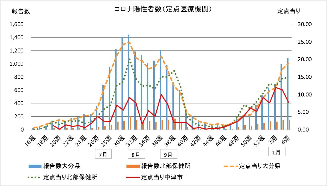 中津市を含む県北部は148人(先週146人)、定点当り14.8人(先週14.6人)と増加し、中津市は定点当り7.8(先週11.4人)と微減となっています。