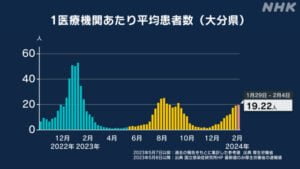 さて、大分県は、令和6年5週(1月29日~2月4日)の新型コロナウイルスの感染者数が58定点医療機関からから1,115人(定点当り19.22人)報告され、先週の1,092人(定点当り18.83人)と比較すると増加しています。