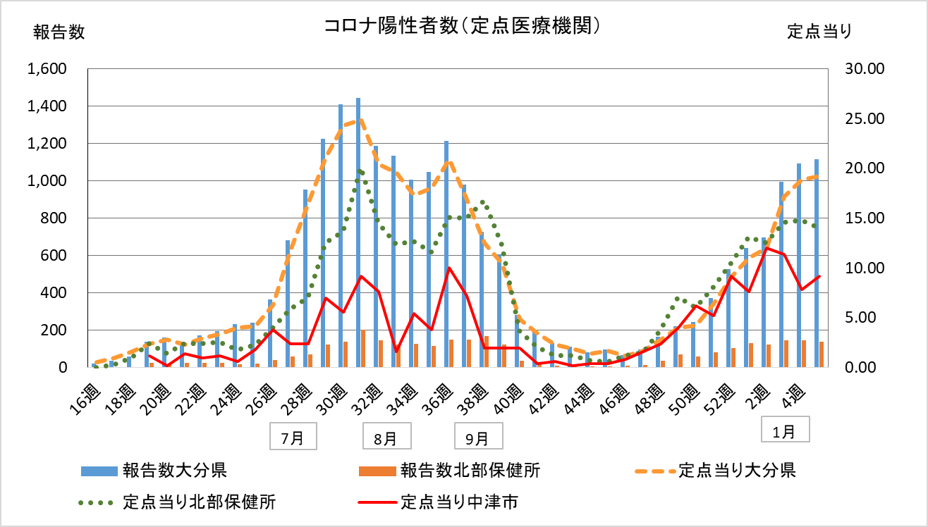 中津市を含む県北部は140人(先週148人)、定点当り14人(先週14.8人)と減少していますが、中津市は定点当り9.2(先週7.8人)と増加しています。