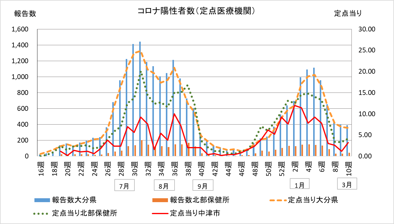 中津市を含む県北部は42人(先週33人)、定点当り4.2人(先週3.3人)、中津市は定点当り3.2(先週1.2人)と増加しています。