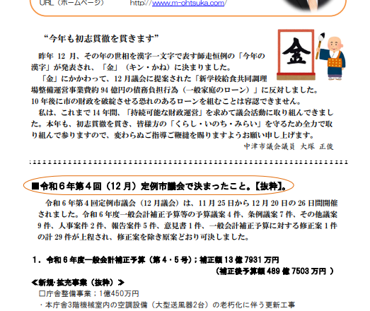 おはようございます。中津市議会議員の大塚正俊です。 昨日、12月議会の一般質問、議案質疑の議事録を作成し、まちづくり通信の作成を始めました。年内には...