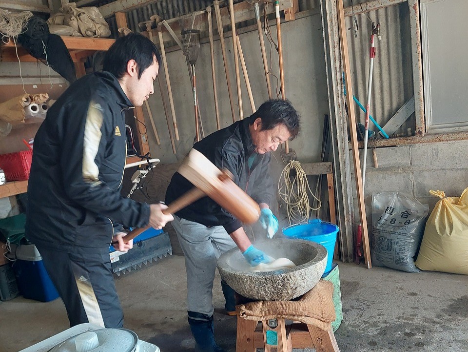 妻の母と妹、甥、娘の夫、息子の8名で約22kgのもち米を約2時間で搗き上げました。