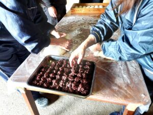 約100個のあんこの玉を、チマチマと餅でくるむ作業は大変です。