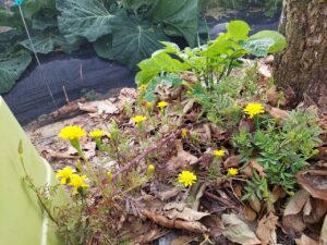 1月にもかかわらず、根元にはマリーゴールドの黄色い花が咲いていました。