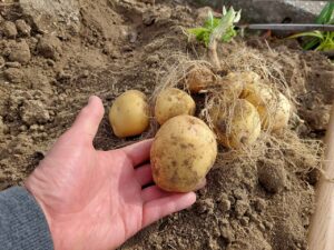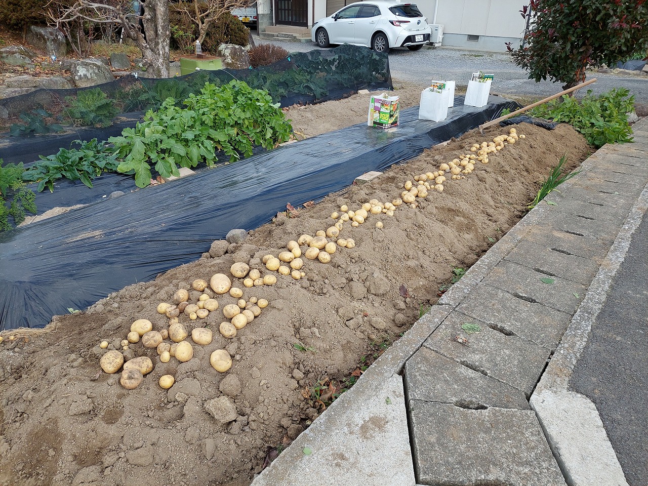 葉っぱは青々していますが、霜が降りる前に収穫しないとジャガイモが痛むらしいので掘りあげました。