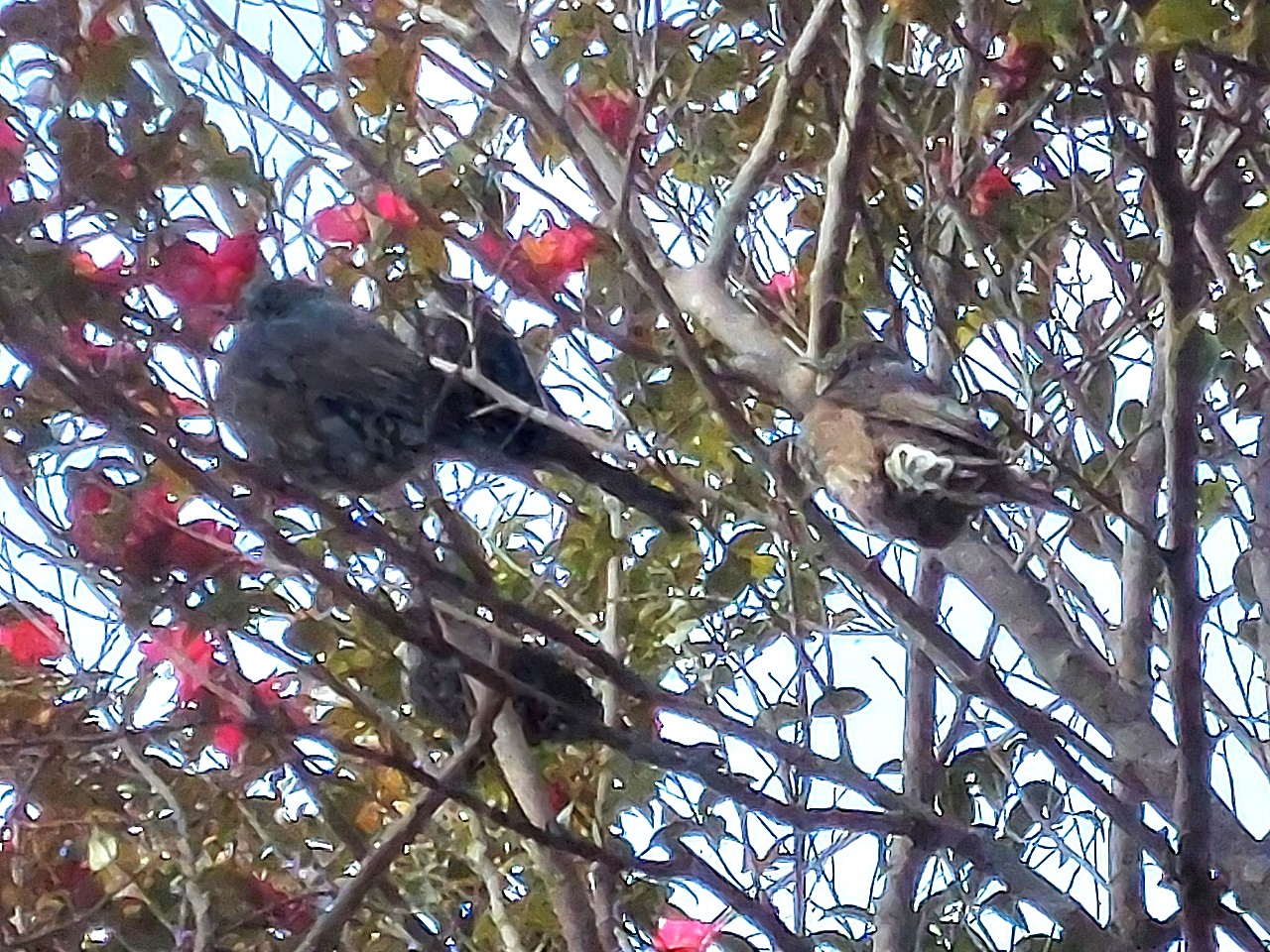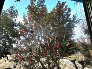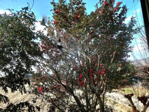 さて、裏庭の山茶花に、ヒヨドリがやってきました。