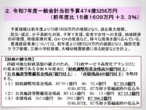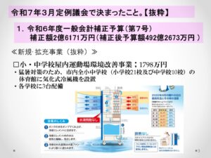 3月議会は、2月25日から3月25日の29日間開催され、令和7年度一般会計予算等の予算議案17件、条例議案22件、その他議案1件、人事案件4件、報告案件3件、請願1件、決議1件の計49件が上程され、全ての議案等を原案どおり可決しました。