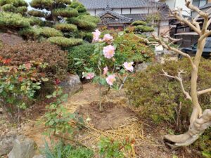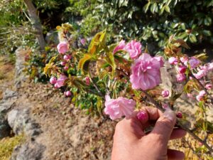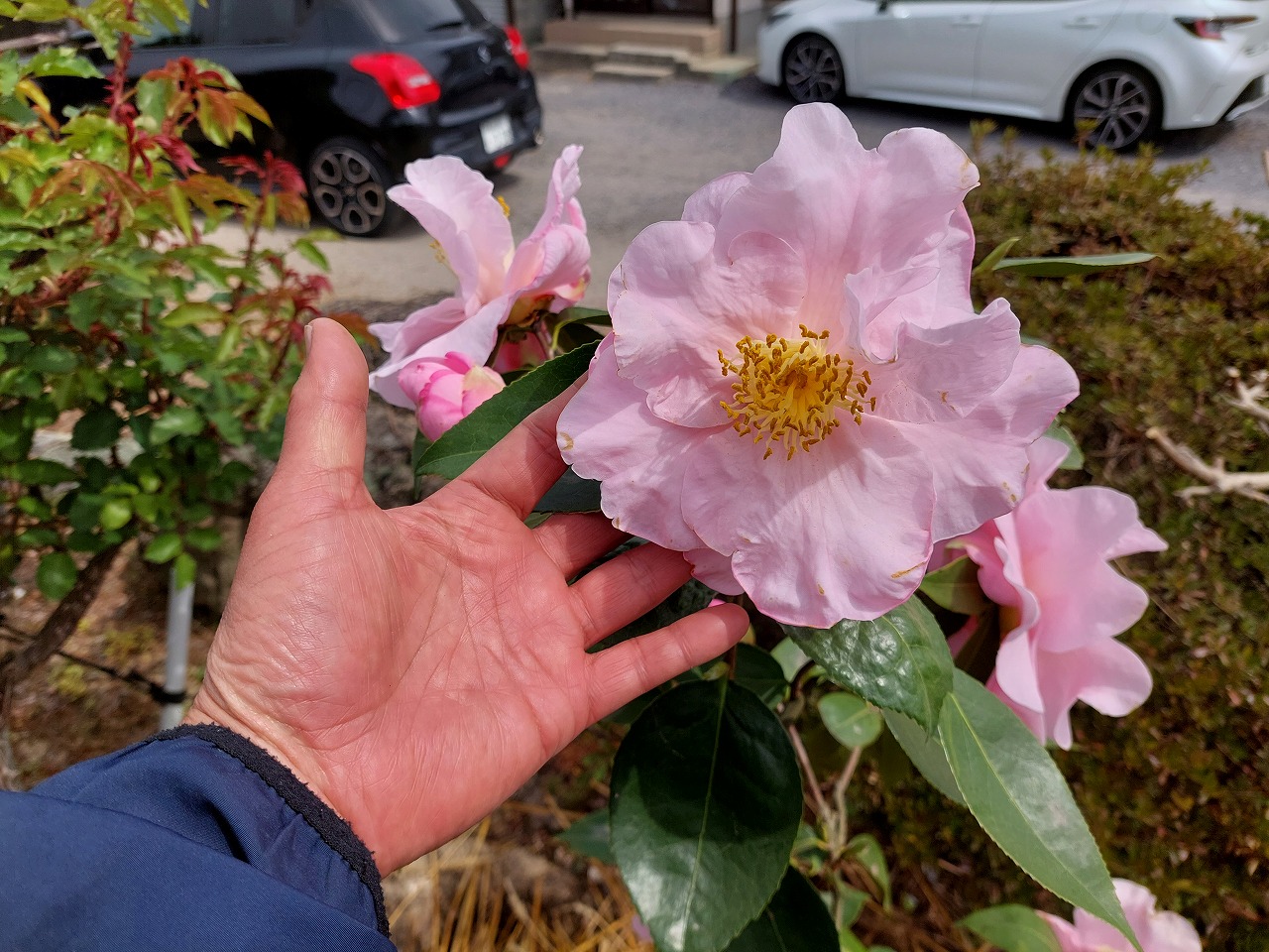 先週、久留米緑化センターで購入し、土曜日に植えた椿と八重桜が見ごろを迎えました。