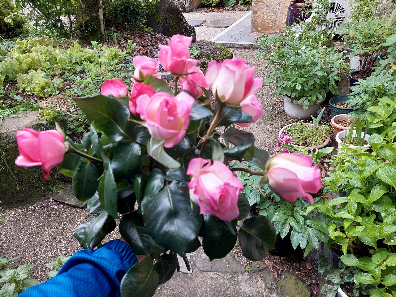 さて、母の日のプレゼントに庭のバラで花束を作りました。