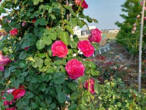 手前の薔薇は、「オセロ」というツル薔薇で、大輪・深紅色〜紫へ退色し、強い香がします。